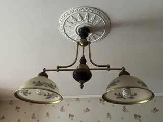 Lustre suspension vintage d'intérieur Structure en métal doré et bois foncé, avec deux abat-jours en verre décoré de motifs floraux. A prendre sur place à Montfermeil