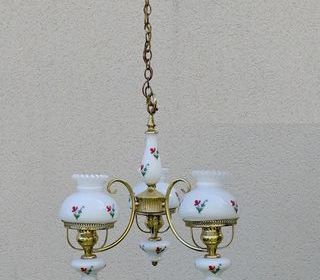 Lustre vintage (années 60-70) métal doré et opaline blanc avec fin décor floral Diamètre : 400 mm; hauteur : 500mm chaine de 250 mm Nombre d'ampoule: 3 (non incluses) Puiss