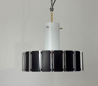 Superbe suspension scandinave en métal brossé, plastique et bois. A noter quelques traces sur l'abat-jour. L'électricité a été refaite. Douille à vis gros culot (Ampoules E27).