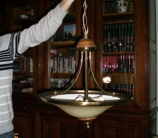cause double emploi vends lustre 3 lampes en bois merisier foncé et laiton Très bon état Contact UNIQUEMENT par téléphone Je ne réponds ni aux SMS ni aux emails
