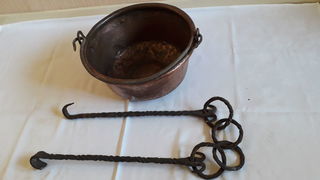 "Grand chaudron en cuivre de cheminée avec sa anse en fer forgé fourni avec suspension en fer forgé d'une longueur totale de 115cm Diamètre 34 hauteur 16 cm poids 2,650kg"