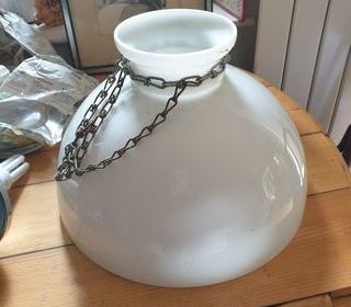 Grande suspension blanche, vintage Dimensions - Diamètre : 24 cm - Hauteur : 25 cm Envoi possible, pour consulter toutes les offres, tapez Régine - Aix-les-Bains