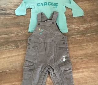 Vends Salopette + tee shirt manches longues enfant garçon " orchestra bébé " couleur gris/vert - taille 6 mois - Très bon état - prix 6 euros