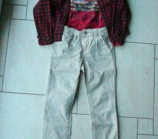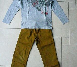 Ensemble taille 7 ans composé de : - 1 pantalon moutarde avec ceinture réglable, - 1 tee-shirt gris à motif assorti. Très bon état. N'hésitez pas à regarder mes autres annonces