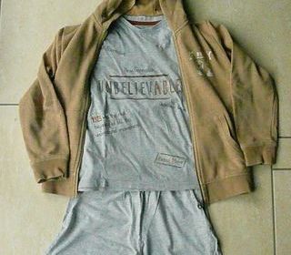 Tenue de sport 3 pièces taille 10 ans composée de : - 1 short gris ceinture élastique, - 1 tee-shirt gris à motif assorti, - 1 sweat beige zippé à capuche assorti. Très bon éta