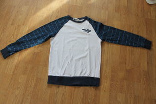 Vends Tee shirt garcon 12-14 ans (158-164) Devant et dos blanc Manches longues bleues Resserré à la base et aux poignets 100 % Coton Prix 8 €