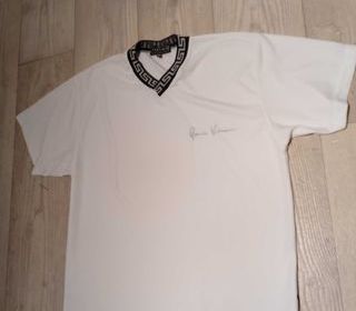 Tee-shirt blanc homme col V de marque versace jean couture voir photo niveau cou logo manche gauche + bas gauche voir photo également et écriture sur le devant poitrine gauche à