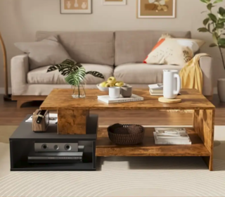 Table basse en bois et noir, au design moderne et fonctionnel, parfaite pour un salon chaleureux et organisé. Cette table associe la chaleur du bois naturel à la sobriété du noi