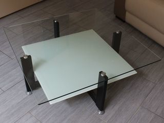 Dessus en verre transparent 90 x 90 cm plateau inférieur en verre coloré 70 x 70 cm Pieds métal noir réglables