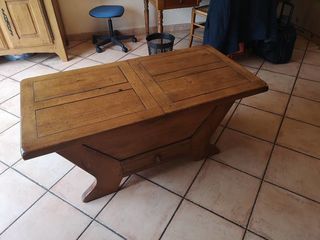 Table basse en chêne massif avec ouverture dessus qui offre un très grand rangement. En bon état mais une petite trace de brûlure sur un plateau.