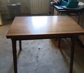 Table rectangulaire clairet pieds et corps en metal ,support synthétique Très solide , bon état Dimensions Long 1,50m Larg 0,75 cm Haut 0,77cm