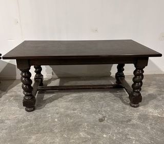 Belle table de salle à manger en bois massif, de style ancien, avec pieds tournés en balustre et entretoise centrale, offrant une excellente stabilité. La table dispose de 2 rallo