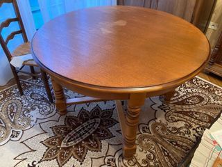 Table ronde avec rallonge. Hauteur 77 cm. Dimensions Sans rallonge : diamètre : 118cm, Avec rallonge : L 156, l ; 118. On donne avec gratuitement 4 chaises empaillées (état m