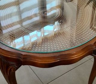 Table ronde diamètre 80 cm avec plateau en verre trempé + 4 chaises en excellent état.