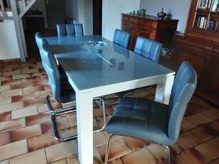 Je vends cette salle à manger complète composée d'une table laquée blanc avec 6 chaises assortes . Type de produit composition 1 table 6 chaises 1 buffet. Matériaux laqué blanc