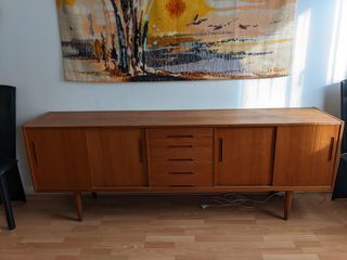 Ensemble scandinave vintage en teck des années 1960, fabrication suédoise Hugo Troeds (Bjärnum), comprenant : ?? Une enfilade basse 4 portes coulissantes avec bloc central de tir
