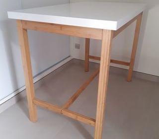 Table haute en bois - Longueur : 120 cm - Largeur : 70 cm - Hauteur : 91 cm - 4 à 6 personnes - Plateau laqué blanc épaisseur 4 cm ; quelques traces peu visible - Pieds démontables