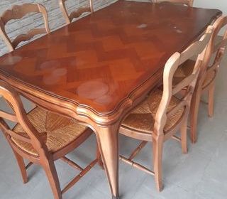 Table de salle à manger extensible de style Louis XV mérisier ? Accueille entre six et dix convives grâce à ses deux rallonges qui se glissent sous le plateau principal avec quelqu