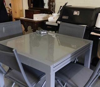 Cause déménagement en appartement, vend table de jardin 90x90 cm. Avec allonge => 180à-90 cm Plateau verre. 4 chaises en textylène pliables grises assorties. Etat neuf. A ven