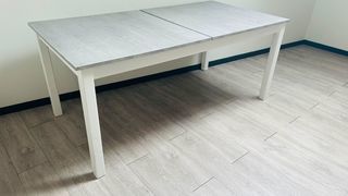 Table de salle à manger blanche très costaud d'une longueur de 2 m + 2 rallonges de 40 cm la largeur est de 0 .85 cm état très correct Prix négociable