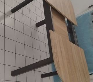 BUFFET : en bois massif chêne clair, pied en inox. Très bon état. 3 tiroirs et 2 portes. avec niche. Dimensions : 182 X 50 X 82 TABLE : en bois massif clair, chêne clair, pied i