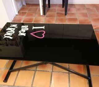 Jolie table basse de salon moderne, sur roulettes, très bon état. Facile à nettoyer si tachée et très pratique. Partie vitrée centrale, un tiroir d'un côté et une niche de l'autre.