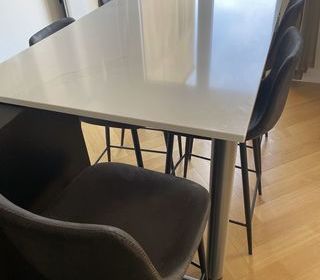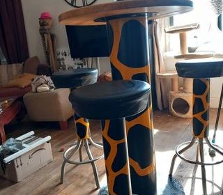 Table bar style girafe trois tabourets pied en métal assise cuir ,plateau bois très lourde