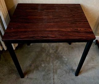 Petite table marron (mélaminé et pieds metal noir) pouvant servir en cuisine ou en appoint dans un bureau, etc... Dimension: L : 0,71 l : 0,50 H : 0, 72