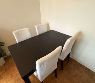Table de bonne qualité de dimensions 140×80 cm sans rallonge avec pieds réglables en hauteur. 4 chaises de bonne qualité également en bon état. A récupérer sur place et paiemen
