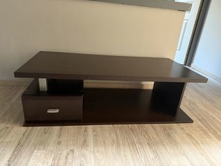 Table basse : TBE. Beaucoup de rangement. 110x60x(h)40 Etagère bois couleur beige. Cadre acier couleur noire. Espace de rangement fermé au centre(ouverture sur le côté) Bonne