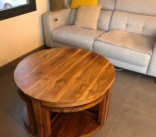 Après partage , vends cette très belle table ronde en palissandre massif - des années 90 - avec ses quatre tabourets qui s'y insèrent astucieusement . Diamètre de 90 cm et hauteur