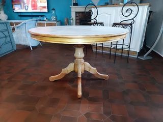 ELEGANTE TABLE RONDE A RALLONGE, IDÉALE POUR UNE CUISINE DE STYLE OU UNE SALLE A MANGER CLASSIQUE. UNE TABLE DE BELLE QUALITÉ AVEC PIED CENTRAL EN BOIS, LES ALLONGES SONT EN BOIS