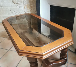 Table basse en bois massif avec une vitre sur le dessus. Pieds sculptés, très bon état. Dimensions : longueur = 120 cm, largeur = 62 cm, hauteur = 43 cm.