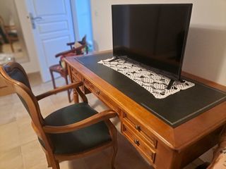 Vend table de salon dessus cuir et bois avec 2 rallonges de 20 cm Dimentions : L 90 cm +40cm avec les 2 rallonges larg 48 cm H 52 cm 2 tiroirs