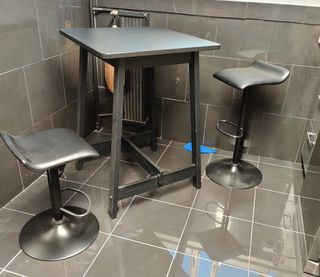 Ensemble composé d'une table haute carrée noire en bois et de deux tabourets de bar noirs avec assise en plastique et pied métallique rond. L'ensemble est adapté pour une cuisine o