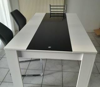Table blanche avec une vitre noire au centre. Longueur 160 cm largeur 90 cm hauteur 75 cm. Style contemporain.