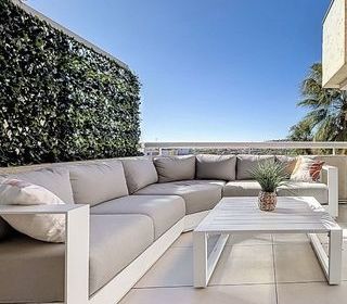 Salon d'angle de jardin "ALLURE" Hespéride + table + housse protection Excellent état Couleurs : gris et blanc Conçu en aluminium teinté, le salon "ALLURE" est composé d'un cana