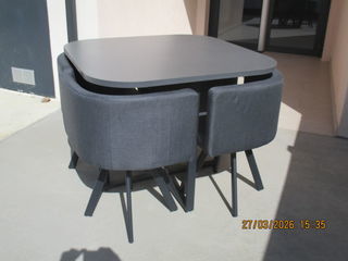 table avec 2 rallonges rabattablres et 2 chaises qui possède sous le plateau un support pour ranger : nappe ou set ou ce que vous souhaitez avoir à porter de mains. A VENIR CHER