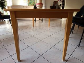 Table à manger extensible en bois de hêtre ( bois clair) 140cm en longueur passant à 190 cm avec la rallonge amovible facile à installer. Pour 6 personnes. Photos prises avec la ra