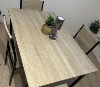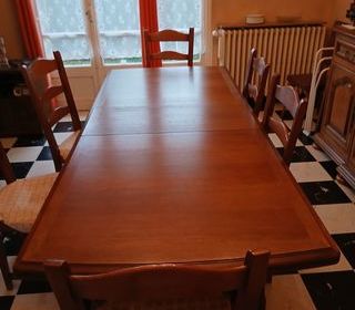 Vends table de salle à manger en bois massif style Louis XIII avec deux rallonges et 4 chaises Longueur 1,80m, 2,80m avec les 2 rallonges de 0,50m chacune.