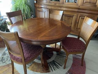 tres belle table ronde en merisier avec 4 chaises etats impecable . cause : changement de style