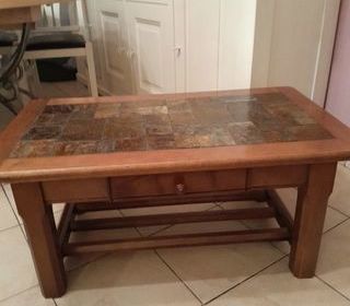 Vends une Table basse de salon, entourage du plateau en chêne, piétement en hêtre, plateau en schiste, dimensions 95 x 55 x 43, en excellent état.