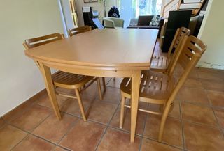 TRES BONNE OCCASION vendue cause changement déco (chaises impeccables = valeur unitaire >60€) Table extensible (placage couleur hêtre orangé) avec 2 rallonges coulissantes inté