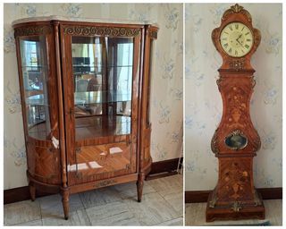 Meubles salle de séjour style Louis XVI comprenant: Un buffet bas avec plateau en marbre et très grand miroir Un vaisselier Une horloge Une table avec ses 8 chaises Le tou