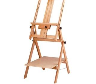 Chevalet d'atelier robuste et solide en bois de hêtre huilé Superficie au sol : 60 × 68 cm Hauteur maximale de la toile : 125 cm Hauteur totale : 151 - 229 cm Poids : 11,5 kg