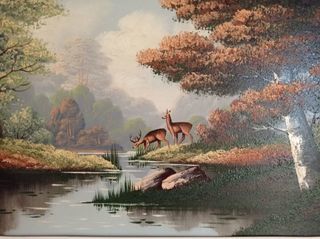 Ce tableau de biche et cerf s'abreuvant à la rivière dans un sous- bois éclairera votre intérieur de douceur.