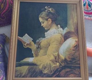 TABLEAU FRAGONARD ENCADREMENT DORE AVEC MOULURE larg 0.47 H 0,57_ Peinture vintage du 18e siècle, représentant une jeune femme lisant un livre, encadrée dans un cadre doré de s