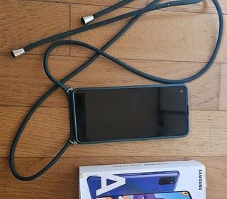 Samsung A21s avec écran de protection et coque avec lanière.