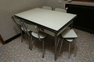 Table de cuisine ancienne en formica en parfait état avec 2. rallonges 4 chaises 3 tabourets. Matériel très solide en tube inox de bonne qualité. Possibilité d'avoir 1 chaise sup