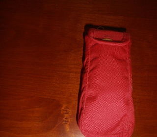 Pochette en toile rouge pour téléphone portable, pouvant se glisser sur la ceinture, ou s'attacher sur n'importe quel support grâce au mousqueton placé à l'arrière, fermeture p